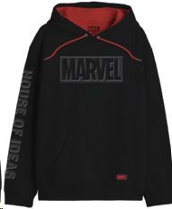 Luce con orgullo el emblema del universo de superhéroes más famoso del mundo con esta sudadera oficial de Marvel. De corte moderno y estilo urbano, combina un elegante negro con detalles en rojo, tanto en el interior de la capucha como en los cordones, creando un contraste dinámico y llamativo.