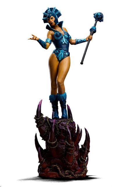 La estatua muestra a Evil-Lyn en una pose dominante y confidente, sobre una base detallada que evoca los temas oscuros y místicos del universo de los Masters of the Universe. La atención al detalle en su traje y el bastón mágico refleja su poder y estatus como una hechicera formidable dentro del mundo de Eternia.