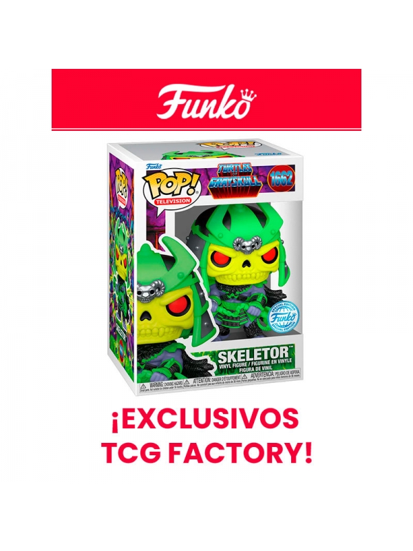 ¡El mal absoluto se reinventa con estilo mutante! Esta figura exclusiva de Skeletor Turtles of Grayskull, fabricada por FUNKO, mezcla lo más oscuro de Masters del Universo con el rollazo ninja de las Tortugas Ninja. Con sus 9 cm de puro villano POP!, es una joya de edición especial limitada que grita "¡yo tengo el poder del caos!"