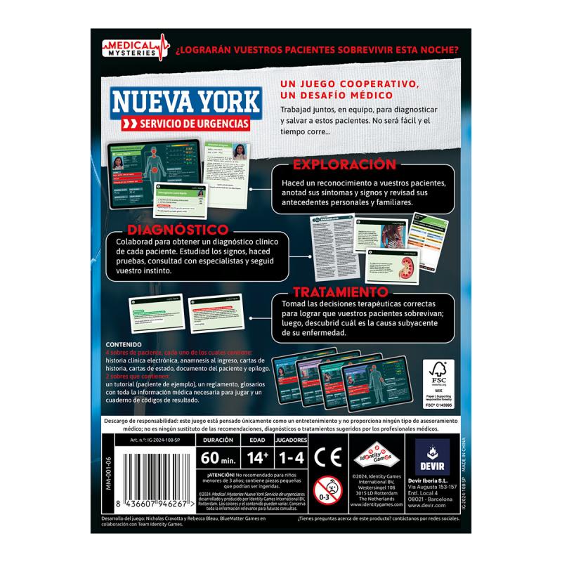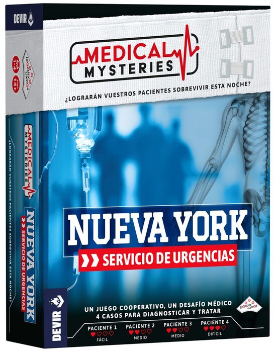 Diseñado por Rebecca Bleau y Nicholas Cravotta, en Medical Mysteries New York trabajaréis en equipo para resolver casos médicos y ayudar a vuestros pacientes. El tiempo avanza, así que aseguraos de tomar las decisiones correctas para salvar al paciente lo más rápido posible. La caja incluye un tutorial para aprender las mecánicas paso a paso y cuatro casos únicos, cada uno con un nivel de dificultad distinto. Trabajar en equipo es la clave para triunfar en este juego, en el que no son necesarios conocimientos médicos previos.