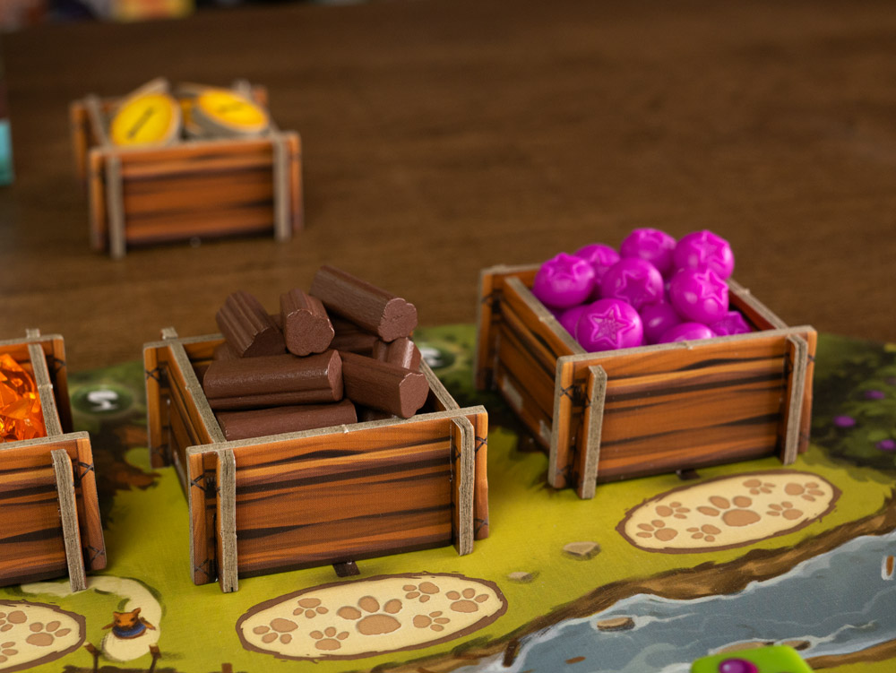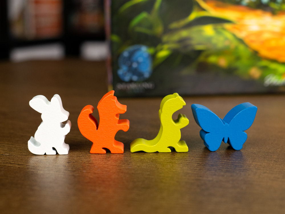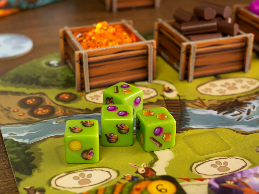 1 reglamento 1 tablero central 4 tableros de hogar 4 dados de recursos 1 dado de 8 caras 12 figuras de amigos (3 mariposas, 3 zorros, 3 lagartos, 3 ratones) 60 cartas Bayas Ramitas Resina ...¡y aún más losetas!
