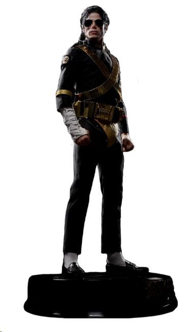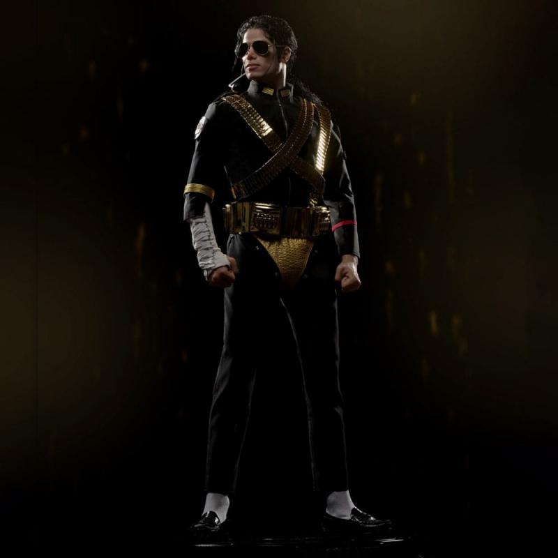 Cada detalle ha sido meticulosamente recreado: desde las gafas de sol y la chaqueta dorada hasta su característico guante y peinado. El realismo del rostro y la pose enérgica evocan toda la fuerza de sus conciertos en directo.