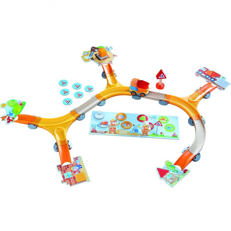 Primer juego para aprender los elementos necesarios para construir una casa. Por turnos se giran las fichas de conos y se descubre el material que debemos llevar a su sitio correspondiente en el tablero utilizando el camión volquete Kullerbü. Combinable con las Pistas de Bolas Kullerbü.