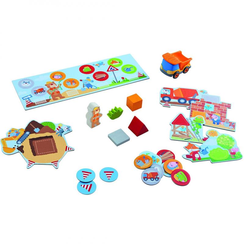 CONTENIDO: 1 camión volquete Kullerbü, 1 aparejador Oso Bruno de madera, 1 plan de ejecución de las obras, 1 obras, 4 partes de un edificio en madera (cimentación, albañilería, tejado, arbusto), 4 depósitos de materiales (cimentación, albañilería, tejado, arbusto), 12 fichas cono, 1 instrucciones del juego.