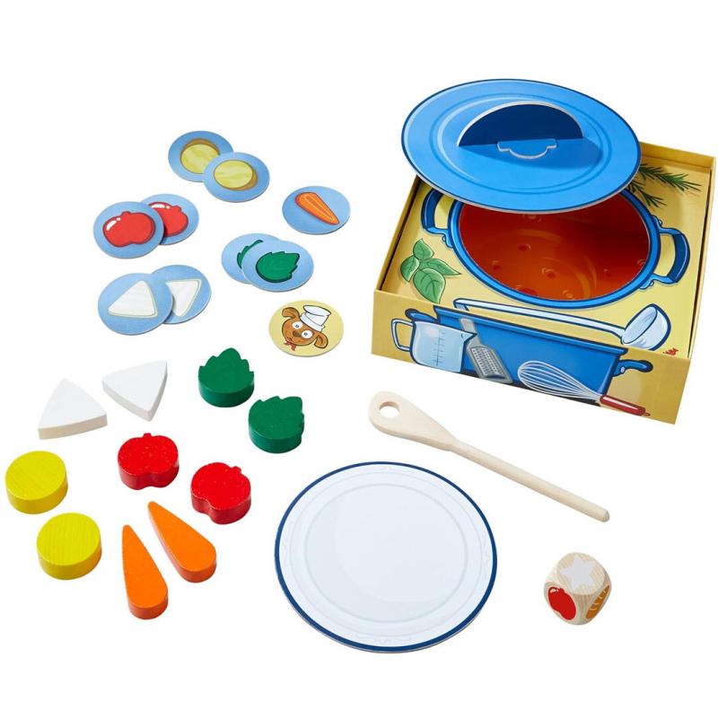 CONTENIDO: 10 verduras de madera, 10 fichas con verduras, 1 plato, 1 dado, 1 cuchara y una caja-cazuela con tapa, 1 instrucciones del juego.
