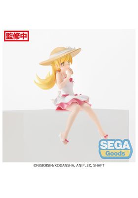 La figura perching de Shinobu Oshino, basada en su aparición en la serie Monogatari, presenta a la entrañable vampira en una versión veraniega y relajada. Con un vestido blanco adornado con detalles rosados, sombrero de ala ancha y su típica expresión inocente, transmite una vibra tranquila y encantadora. Su pose sentada está diseñada para colocarla en estanterías o bordes, aportando un toque original a cualquier colección.