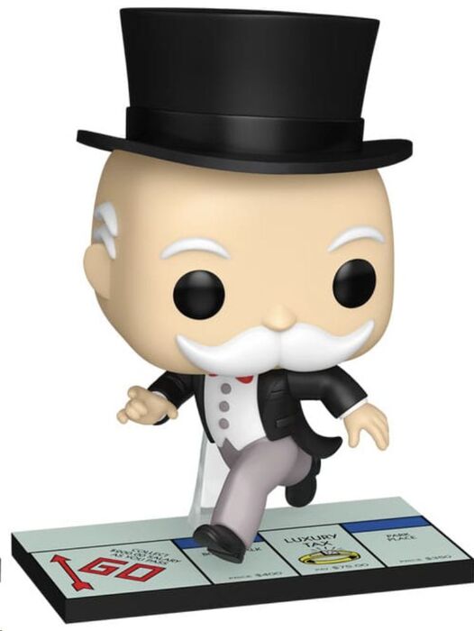 Esta figura Pop! de Mr. Monopoly nos presenta al icónico millonario del clásico juego de mesa en plena acción, capturado justo en el momento en que pasa por la casilla de salida. Vestido con su tradicional frac negro, pantalones grises, pajarita roja y su característico sombrero de copa, la figura transmite energía y dinamismo mientras avanza sobre el tablero. El bigote blanco y las cejas arqueadas le dan su expresión amistosa e inconfundible.