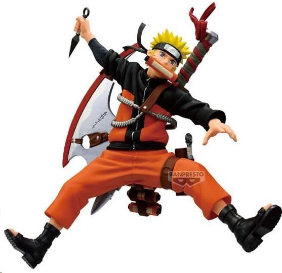 Esta figura de Naruto Uzumaki de la colección Vibration Stars lo muestra en plena acción, con su característico atuendo naranja y negro y una expresión llena de energía. Armado con kunais y equipado con un gran arsenal de armas ninja, refleja toda la esencia del joven shinobi decidido a cumplir su sueño de convertirse en Hokage. La pose dinámica transmite movimiento y emoción, como si estuviera en medio de una batalla.