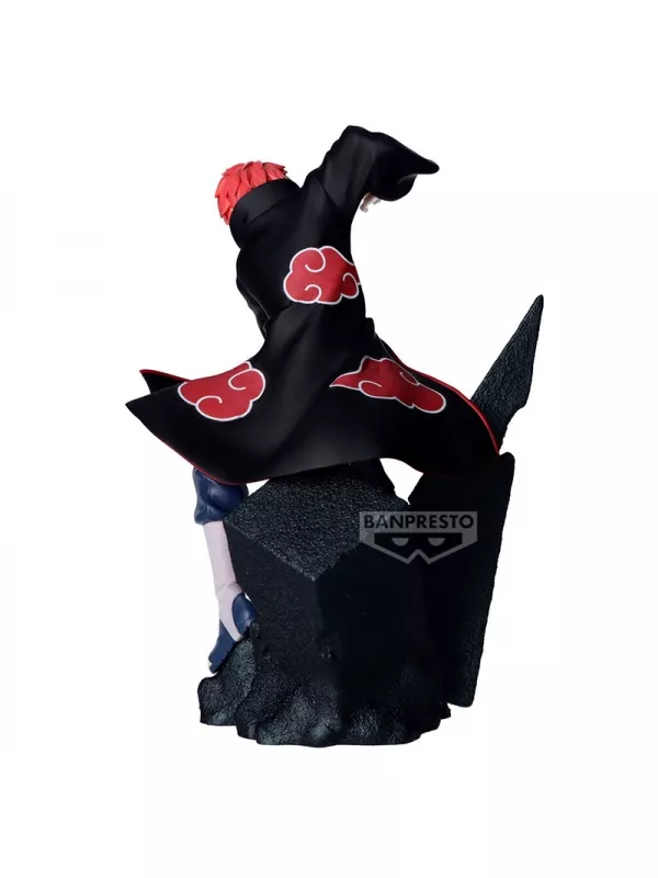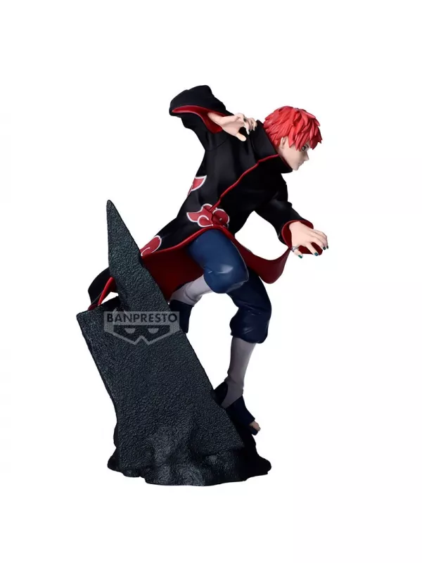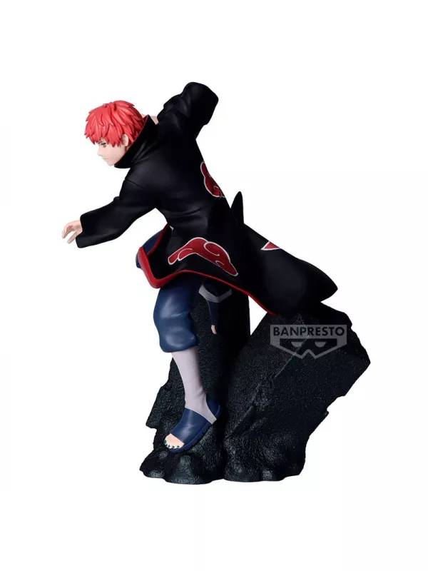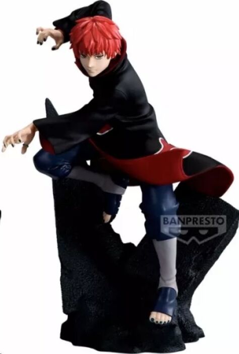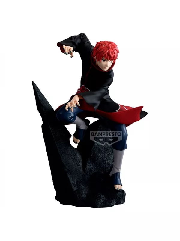 Cada detalle ha sido meticulosamente trabajado, desde la textura de su vestimenta hasta el esculpido de su cabello rojo intenso. La pintura de alta calidad resalta los contrastes entre los tonos oscuros de su túnica de Akatsuki y los matices más vivos de su cabello y piel, logrando un acabado espectacular. La fluidez en los pliegues de su ropa y la posición de sus manos reflejan su destreza en el combate con marionetas.