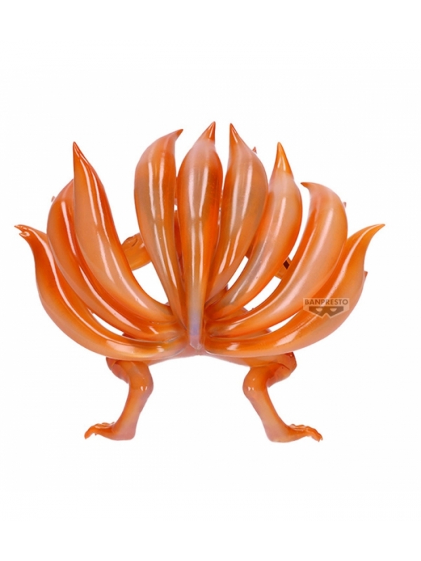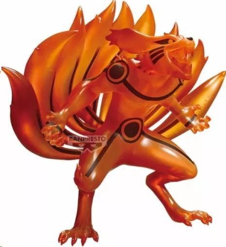 El acabado translúcido en tonos anaranjados y rojos crea un efecto impresionante, simulando la manifestación de su chakra en su estado más puro. Los detalles en negro a lo largo de su cuerpo contrastan a la perfección con el brillo de la figura, destacando los patrones característicos del Modo Sabio de los Seis Caminos. Sus garras afiladas, su mirada desafiante y sus colas en movimiento realzan la presencia imponente de Kurama, convirtiéndolo en una pieza impactante para cualquier colección.