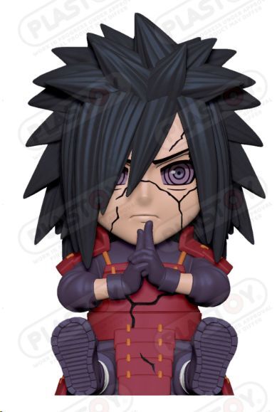 hucha de Madara , inspirada en su imponente apariencia en Naruto Shippuden . La figura muestra a Madara con su característica armadura de batalla roja y su expresión desafiante, con las grietas en su rostro que evidencian su regreso como el portador del Rinnegan.