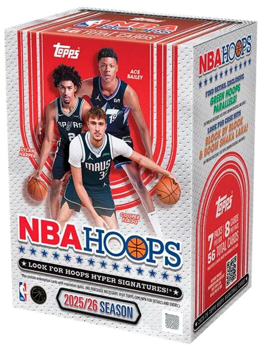 Sumérgete en la emoción del baloncesto con la colección NBA Hoops 2025/26 de Topps en formato Value Box. Una opción perfecta tanto para coleccionistas como para aficionados que buscan ampliar su colección con cartas actuales de la NBA.