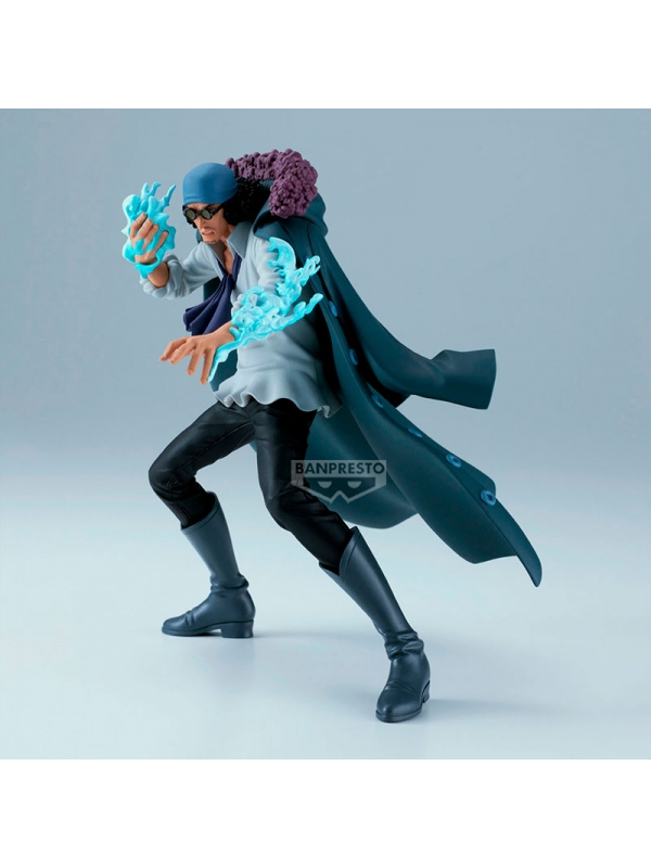 Cada detalle ha sido esculpido con gran precisión, desde la textura de su vestimenta hasta los efectos de hielo que emergen de sus manos. La pintura de alta calidad resalta los tonos fríos de su poder, contrastando con la intensidad de su postura de ataque. Su icónico gorro y gafas completan la apariencia inconfundible de Kuzan, logrando una representación fiel al personaje.