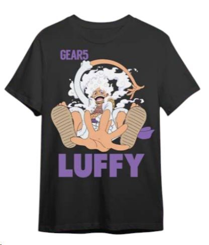 Esta camiseta negra, confeccionada en 100% algodón, ofrece una gran comodidad y suavidad para el uso diario. En la zona delantera, presenta un impresionante estampado de Luffy en su forma Gear 5, con un diseño vibrante y lleno de detalles que capturan la esencia del personaje. Perfecta para los seguidores de One Piece que buscan expresar su pasión con un estilo auténtico y llamativo.