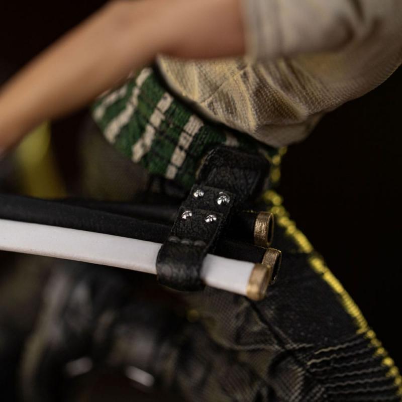 Cada detalle de su atuendo, su expresión seria y el porte desafiante reflejan el espíritu del cazador de piratas, siempre fiel a su promesa de convertirse en el mejor espadachín del mundo.
