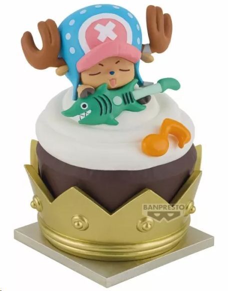 Tony Tony Chopper brilla en esta encantadora figura de la línea Paldolce Collection, fusionando su ternura con un diseño inspirado en postres. Con una altura de 5 cm, esta figura muestra a Chopper descansando felizmente sobre un delicioso pastel con forma de barril, adornado con una corona dorada y una nota musical. Su expresión relajada y el pez guitarra que sostiene hacen que esta pieza sea una representación perfecta de su espíritu alegre.