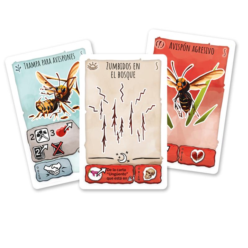 Dentro de la baraja de esta expansión, se encuentran las temibles cartas de avispón, a las que se aplican las mismas reglas que con las otras cartas de dorso rojo. También habrá cartas de peligros evitables, una mecánica que aparece en la primera gran expansión de Paleo, Un nuevo comienzo. El peligro que aparece se puede evitar si se cumplen algunos requisitos. Por suerte, este módulo también incorpora la carta de ungüento, que permite almacenar raíces medicinales para ir curando a los miembros del grupo, o la quema, que se usa para prender fuego a los nidos.