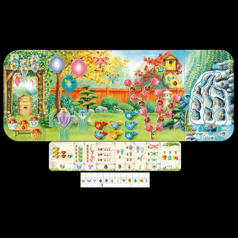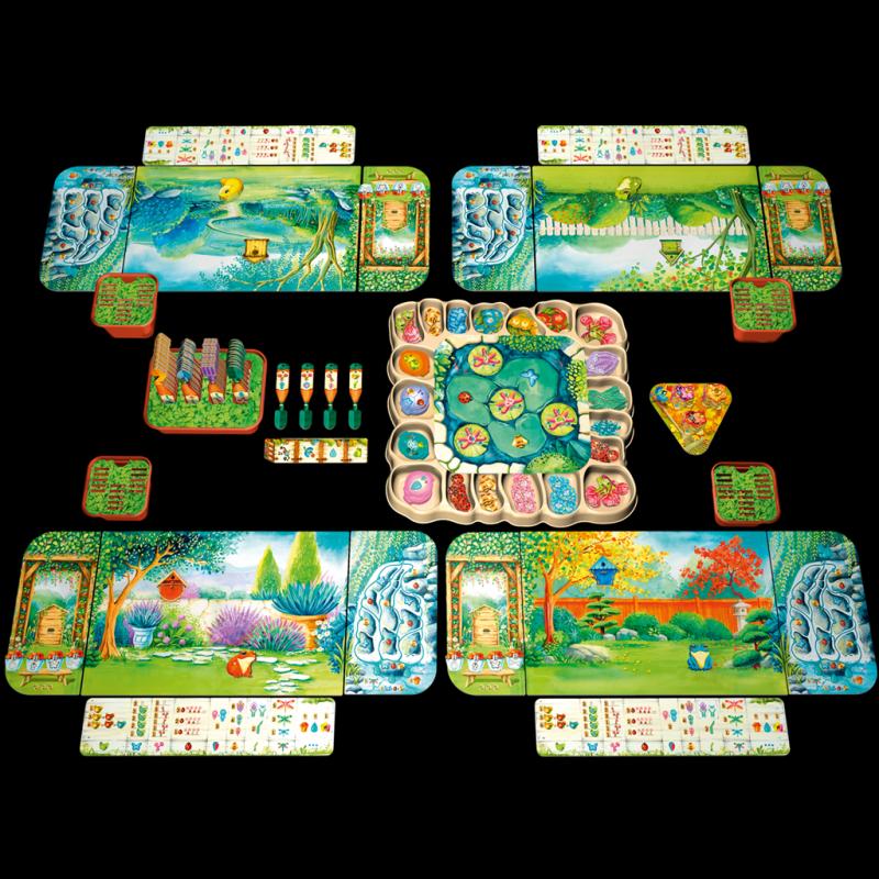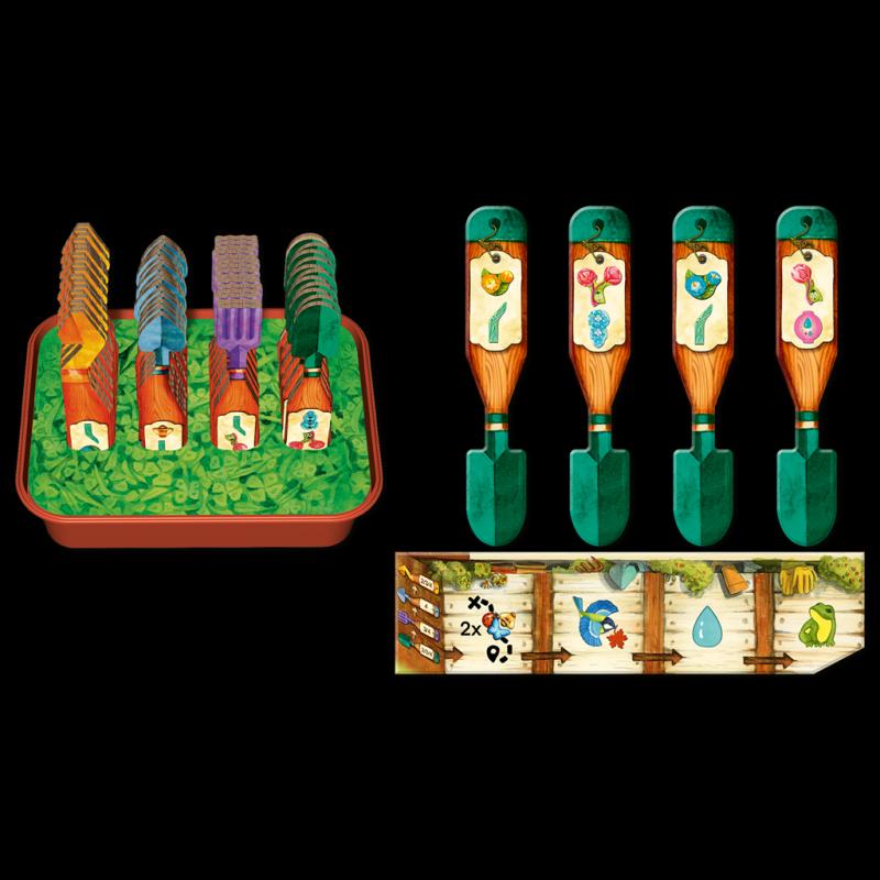 Contenido: tablero de acciones, 4 tableros de jardín, 4 tableros de pérgola, 4 tableros de cascada, 4 tableros de puntuación, tablero de hojas, tablero de Estanque, 63 Herramientas, 107 fichas de Planta, 30 Mariposas, 30 Mariquitas, 40 Abejas, 21 Libélulas, 30 Hojas, 16 Farolillos, 16 Tarros de miel, 4 Casetas de pájaro, 4 macetas de participante, portaherramientas, bandeja de fichas, 8 Gotas de agua, 4 Ranas, bloc de puntuación, reglamento
