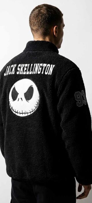 El diseño destaca por su acabado afelpado y su estética en tonos oscuros, con el rostro icónico de Jack Skellington en la espalda acompañado de su nombre, creando un contraste visual muy llamativo. Los detalles en las mangas y el conjunto del diseño refuerzan su identidad dentro del universo de la película.