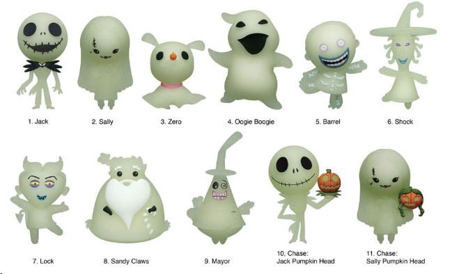 Entre los personajes que puedes encontrar están Jack, Sally, Zero, Oogie Boogie, Shock, Barrel, Lock, el Alcalde, Sandy Claws ¡y dos figuras persiguen súper buscadas: Jack y Sally con cabezas de calabaza! Terroríficamente adorables y listas para iluminar tus noches.