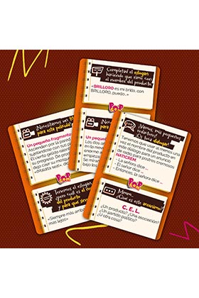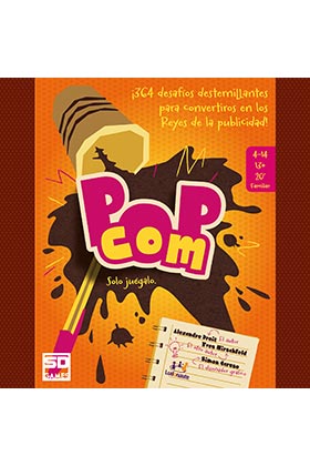 Bienvenido a Pop Com! Felicidades! Acabáis de ser contratados por la élite de las agencias de publicidad. Si os hemos escogido, es porque tenéis todo lo necesario para ser las estrellas de la publicidad del mañana. Pero para llegar a serlo, os lo vais a tener que currar! Por turnos, tendréis que crear eslóganes, diseñar logos, hacer poses, actuar, hacer audios publicitarios... No vais a aburriros... Tendréis que aprender a ser multitarea! Así que ahora es vuestro turno: ingeniad buenas campañas publicitarias, cread magníficos logos y aportad ideas innovadoras. Arriesgad, inventad y, sobre todo, pasadlo bien! Componentes 110 cartas de 63x 88 mm 1 bloc de notas 1 reglamento