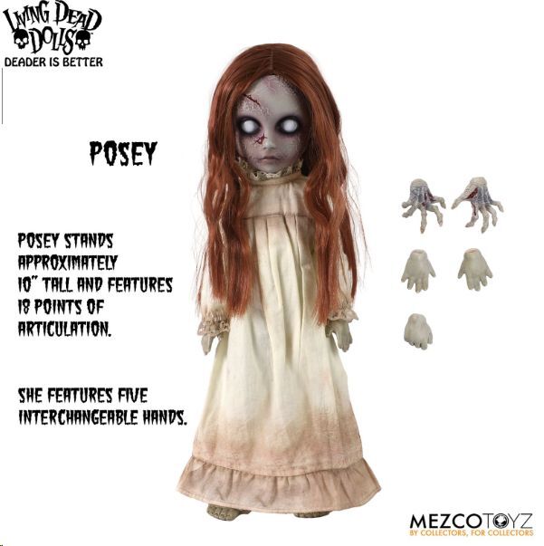 La espeluznante Posey se suma a la colección Living Dead Dolls de Mezco Toyz, con una imponente altura de 25,5 cm que hará temblar a los coleccionistas más valientes. Esta figura luce su característico vestido desgastado, acompañado de unos ojos de cristal que parecen seguirte allá donde mires.