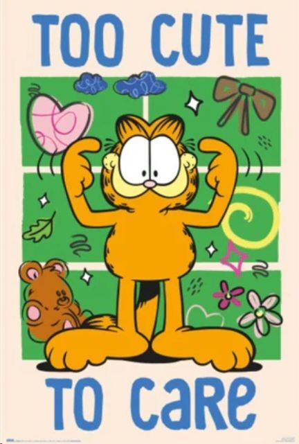 ¡Garfield lo deja claro: es demasiado adorable para preocuparse! Este divertido y encantador póster "Too Cute To Care" muestra al gato más famoso del mundo en su faceta más presumida y adorable, con un fondo lleno de corazones, flores y ositos.