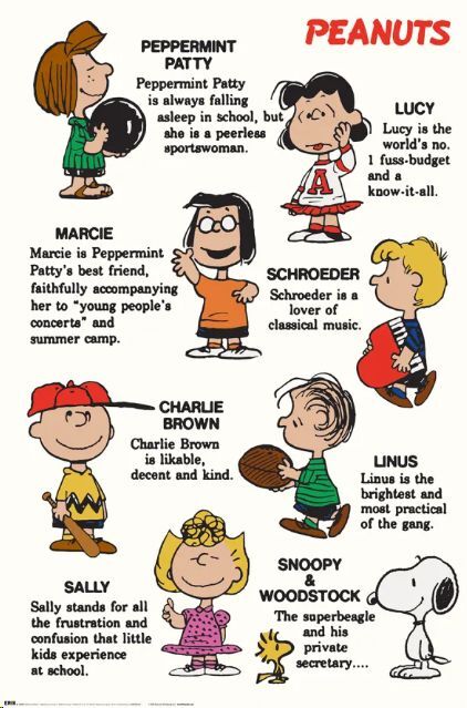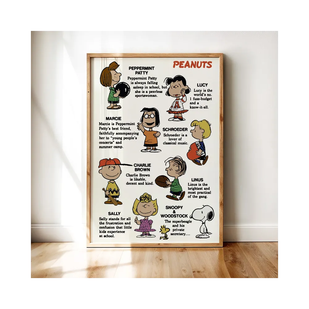 Revive la ternura y el humor clásico de Peanuts con este encantador póster que reúne a los personajes más queridos de la tira cómica. Charlie Brown, Snoopy, Lucy y compañía aparecen acompañados de descripciones que reflejan su personalidad única.