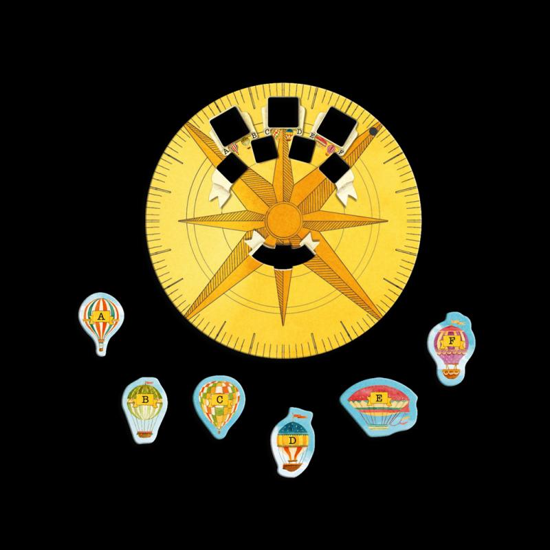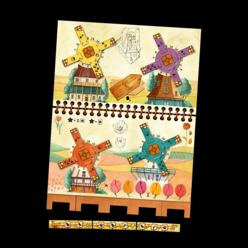CONTENIDO Libro de aventuras, 6 cajas, 4 indicadores de jugador, 74 cartas, 1 dado, 172 fichas, 4 tableros de arroyo, 4 discos de molino magnéticos, 1 dial de rosa de los vientos magnético.