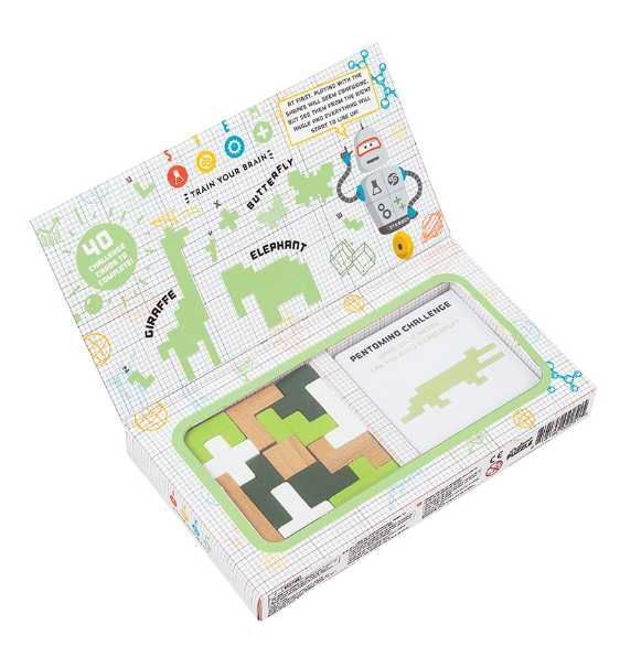 Inicialmente, jugar con las formas puede parecer confuso, pero míralas desde el ángulo correcto y todo se alineará de repente. ¡Usa diferentes combinaciones de los 12 pentominós para enfrentar los 40 desafíos en las tarjetas adjuntas y ver cómo te forma!