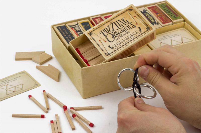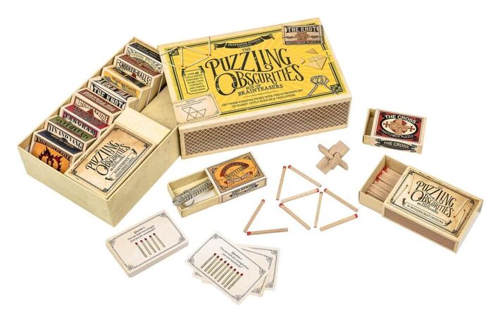 Pon a prueba tus habilidades para resolver problemas con esta selección de 10 rompecabezas de bolsillo. Desde los anillos de fuego hasta el trapecio, cada caja de fósforos contiene un pequeño rompecabezas diferente para resolver. Una vez que los haya dominado todos, vea si puede usar las cerillas de madera para resolver los 50 desafíos de fósforos que se enumeran en las tarjetas.