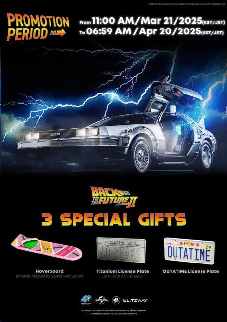 Además, los pedidos anticipados a través de heo incluyen 3 regalos exclusivos: un hoverboard, una matrícula de titanio y la icónica matrícula OUTATIME. Funciona con 8 pilas 6LR61 (9V) o mediante alimentación constante con cable tipo C y adaptador de 9V 2,2A (no incluidos).