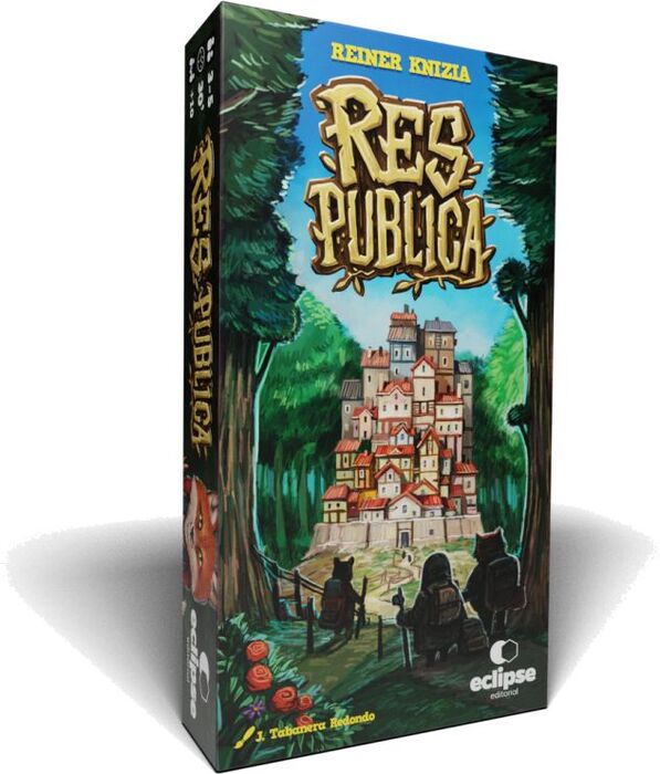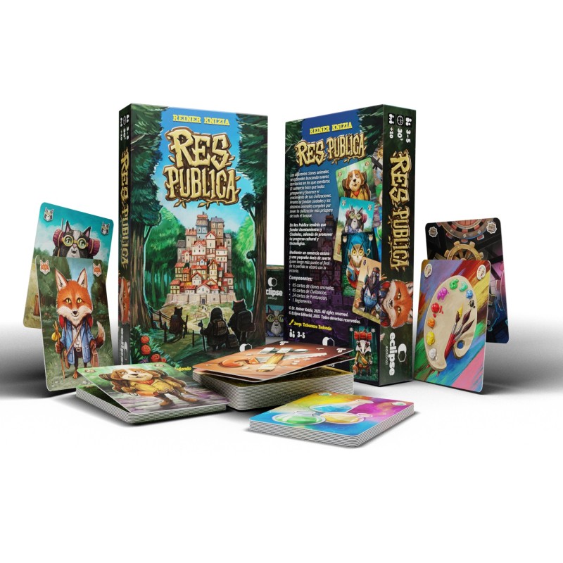Contenido Res Publica: - 65 cartas de clanes animales. 12 cartas de cada animal: Gato, - Perro, Cuervo, Zorro y Tejón; además de 5 cartas de Búho (Monjes). - 65 cartas de Civilización: 12 de Pintura, Escritura, Ciencia, - Arquitectura, Ingeniería y 5 de Libros (Literatura). - 24 cartas de puntuación, repartidas así: 10 Asentamientos, todos de valor 3; 10 Ciudades, de valores 9, 8, 8, 7, 7, 6, 6, 5, 5, 4; 2 Altares de valor 7; 2 Bibliotecas. - Un reglamento.