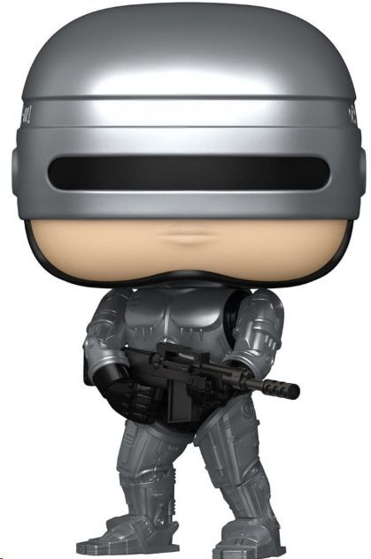 El diseño mantiene el característico estilo POP! con cabeza sobredimensionada y detalles simplificados, pero incorpora elementos reconocibles del personaje, como su visor negro y su armadura tecnológica. La figura aparece equipada con su arma, lista para patrullar las calles de Detroit y hacer cumplir la ley.