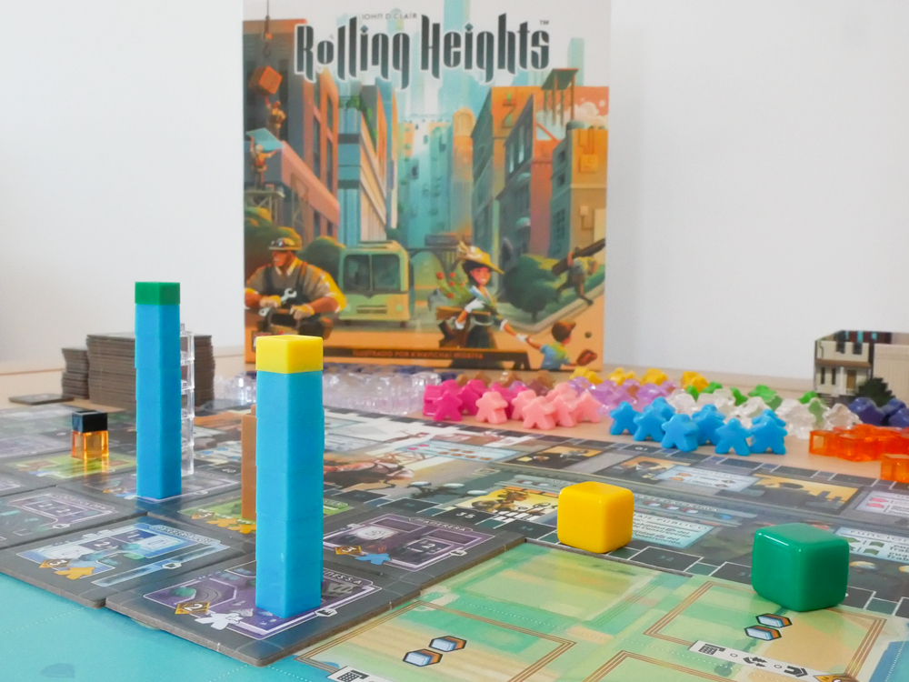 En Rolling Heights, harás «rodar» a los trabajadores que representan tu mano de obra. Aquellos que aterricen de pie te otorgan acciones especiales y materiales de construcción, mientras que los que queden tumbados no te otorgan nada. Siempre podrás tentar a la suerte y lanzar de nuevo, pero podrás perder valiosos materiales que son necesarios para construir nuevos edificios. Completar edificios te otorga prestigio, así como nuevos trabajadores que te ayudarán a construir edificios aún más altos, como los rascacielos.