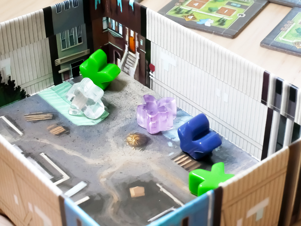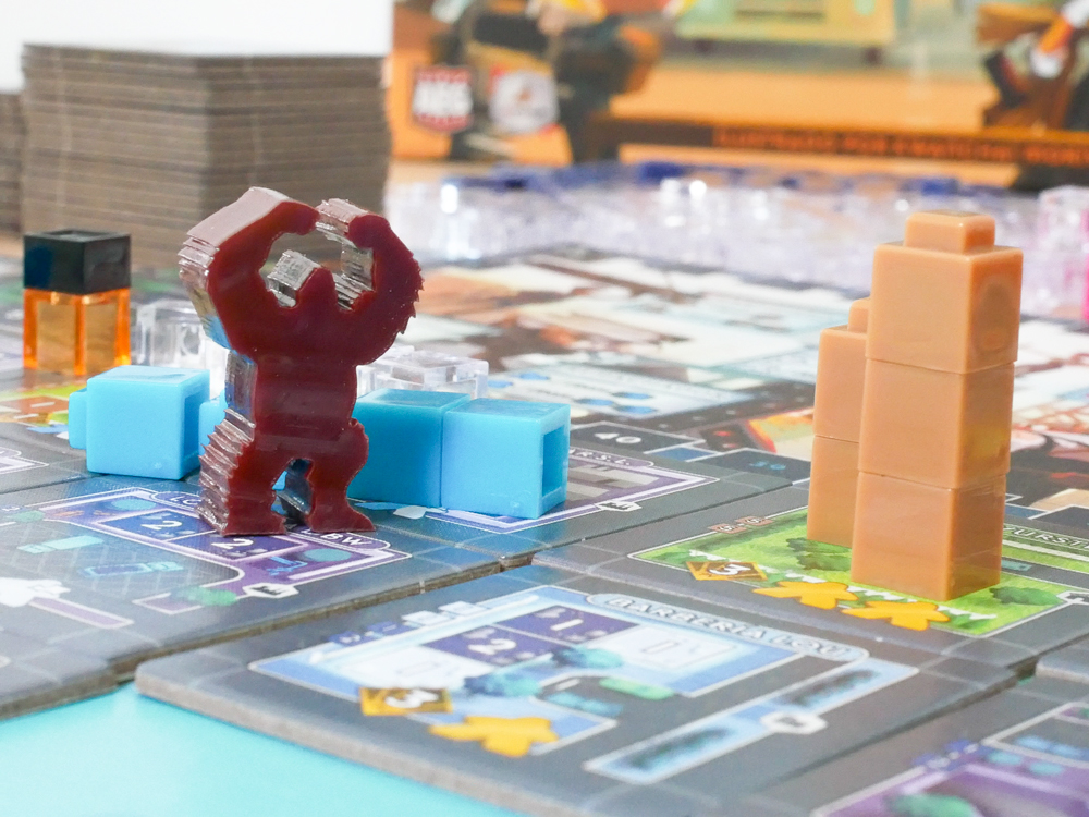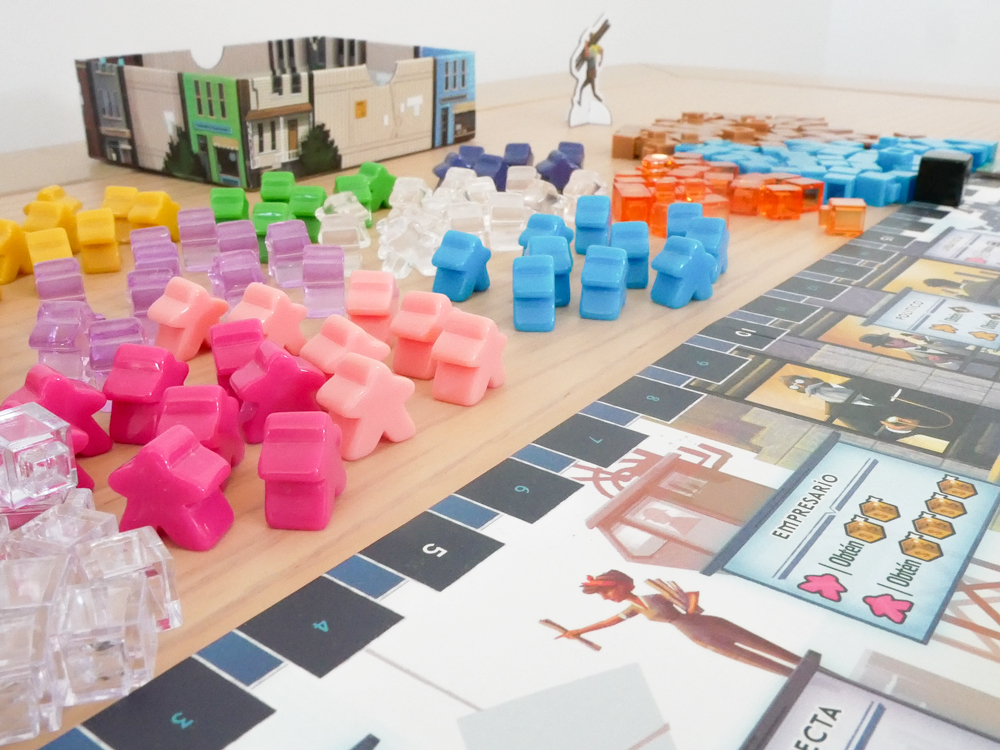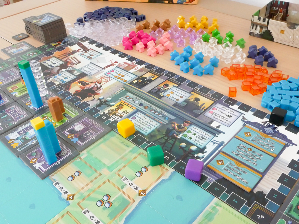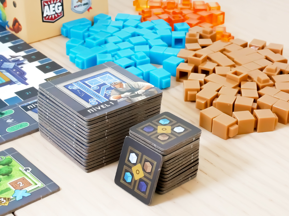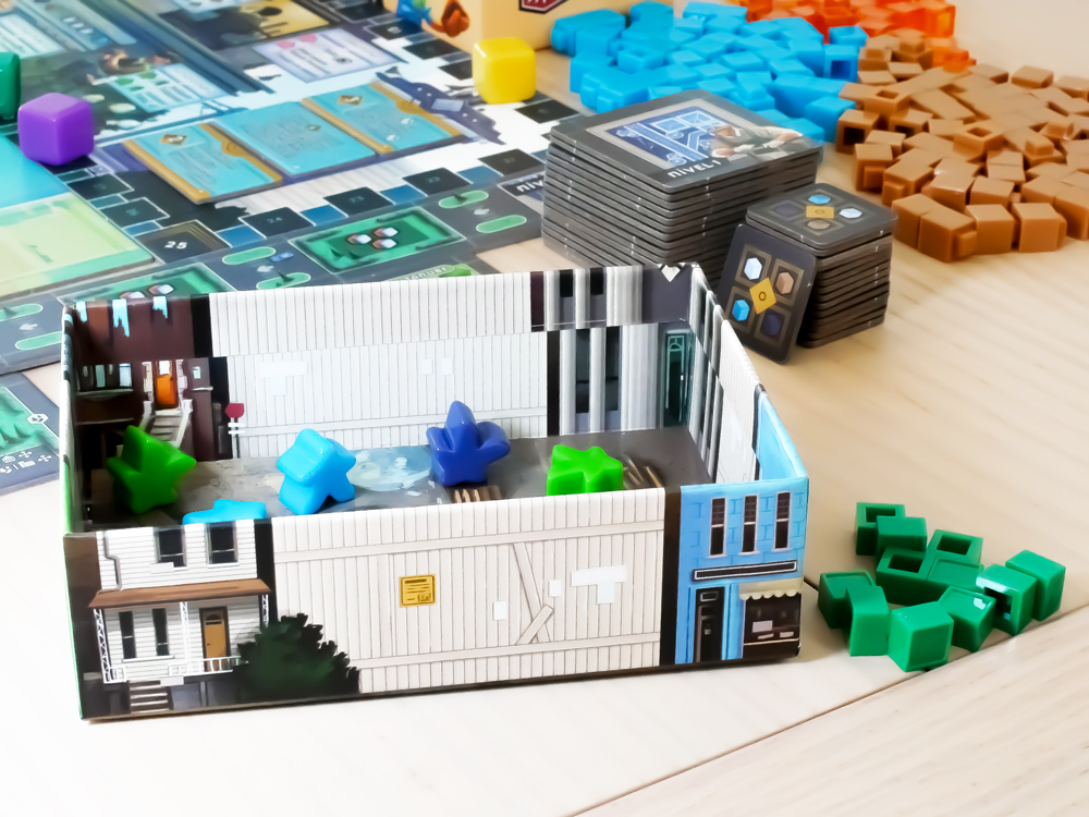 Componentes: 6 tableros de Vecindario (a doble cara) 1 tablero de puntuación 2 franjas de Mercado (en 6 piezas) 78 losetas de Plano de Construcción 1 marcador de jugador inicial 4 marcadores de jugador 4 bandejas de tirada 90 Trabajadores (16 transparentes, 13 azules, 8 azul oscuro, 11 morados, 8 magentas, 11 amarillos, 8 verdes, 7 rosas y 8 marrones) 285 cubos (60 marrones, 80 transparentes, 25 naranjas, 60 azul oscuro y 60 azules) 6 fichas de número de Vecindario 72 marcadores de Propiedad (18 de cada uno de los 4 colores de jugador) 12 losetas de Publicidad 13 losetas de Objetivo 30 fichas comodín