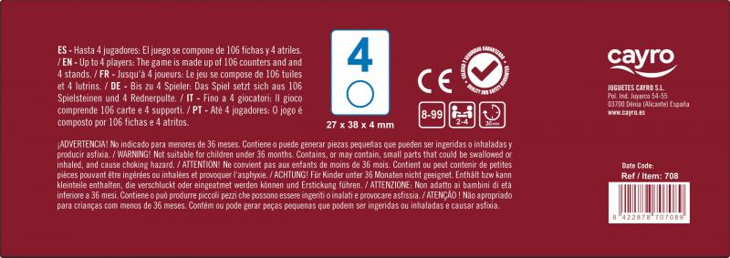 Incluye 106 fichas de gran tamaño (2,7 x 3,8 x 0,4 cm) y 4 atriles, todo guardado en una práctica bolsa con cremallera para llevarlo donde quieras. Ideal para mayores de 8 años.