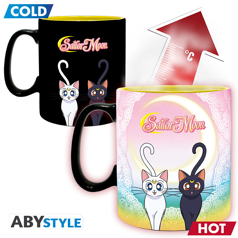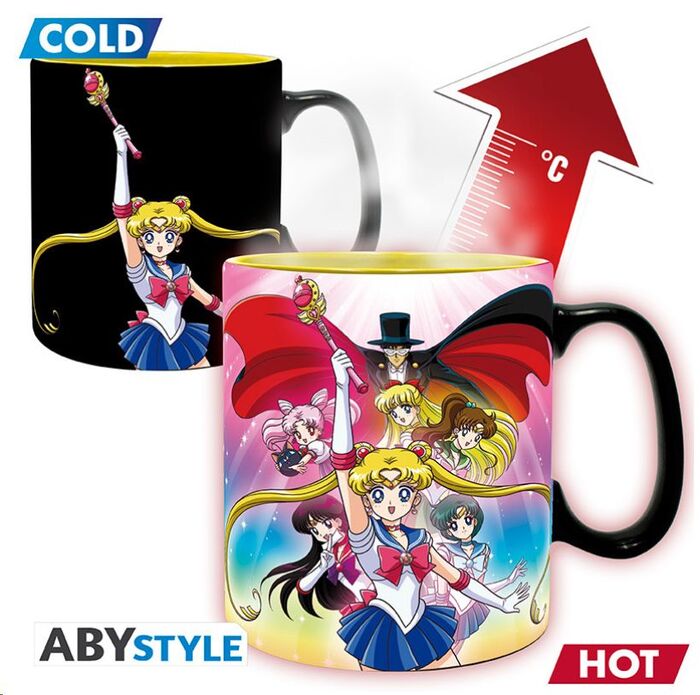 Por el poder del Prisma Lunar, transforma tu bebida con esta taza térmica de Sailor Moon de ABYstyle! Al verter líquido caliente, el diseño revela a Sailor Moon, las Sailor Guardians, Tuxedo Mask y los gatos guardianes, listos para luchar por el amor y la justicia.