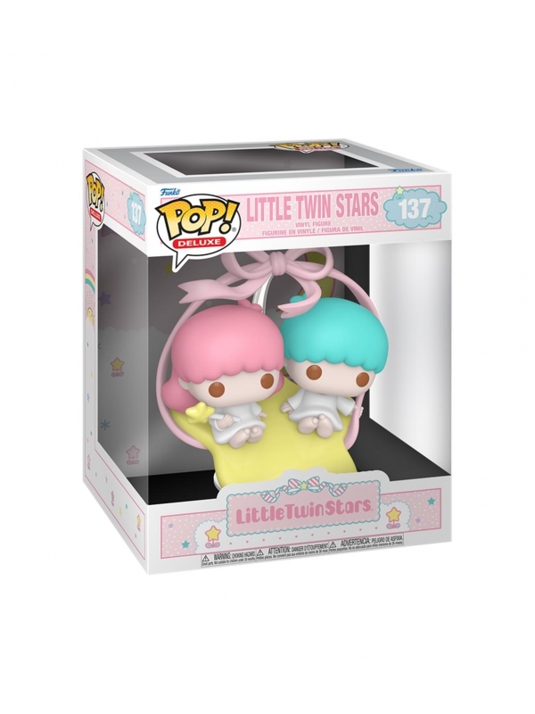 Figura de vinilo de la línea POP! Deluxe inspirada en los adorables Little Twin Stars del universo Sanrio. En esta encantadora escena, los dos pequeños personajes aparecen sentados juntos sobre una estrella amarilla, rodeados por un delicado arco con lazo que aporta un toque dulce y mágico al conjunto.