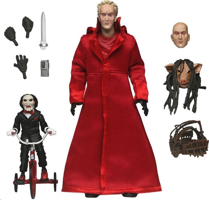 La figura de Ultimate Jigsaw Killer Red Robe viene acompañada de una variedad de accesorios que aumentan su versatilidad y realismo. Entre estos se incluyen una cabeza extra para cambiar la apariencia del personaje, una cabeza con la perturbadora máscara de cerdo, y una serie de herramientas que Jigsaw utiliza en sus macabros juegos: una trampa, una grabadora y una cuchilla. Además, el set incluye tres manos intercambiables que permiten diferentes poses y acciones, así como una figura de Billy en su triciclo, el siniestro muñeco que es sinónimo de las trampas de Jigsaw.
