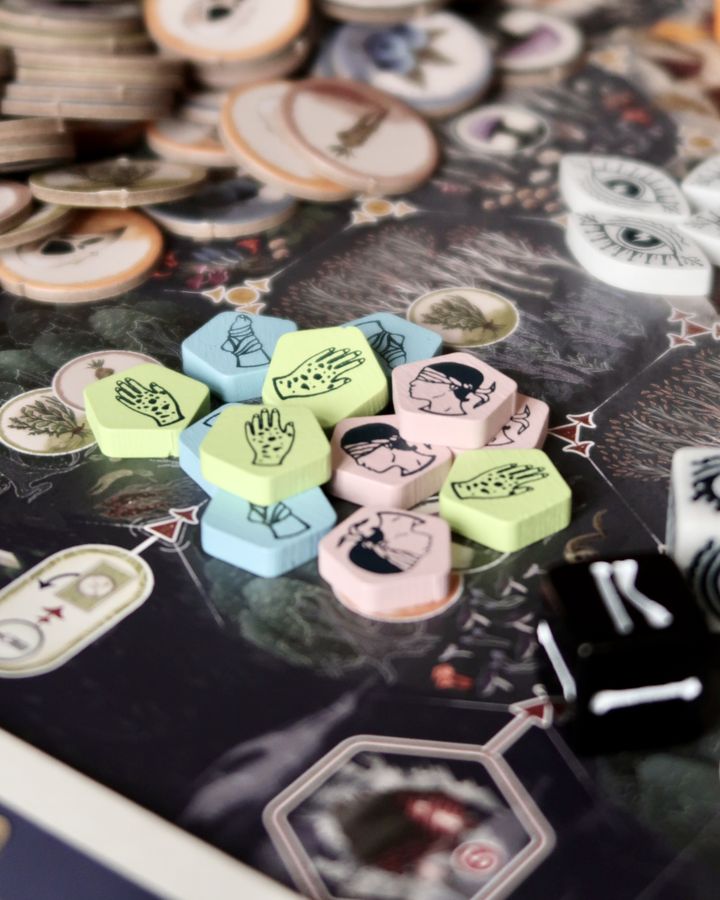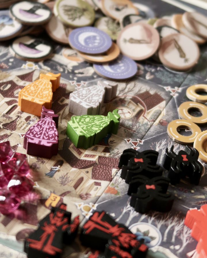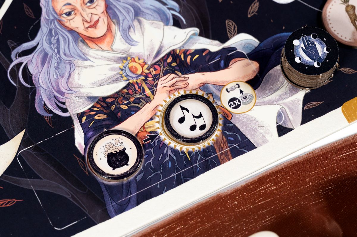Componentes: 28 componentes de madera ilustrados 40 figuras de madera 110+ cartas 230+ fichas de cartón 24 losetas de Bruja 16 Cristales de plástico 4 fichas de plástico 7 tableros 2 dados personalizados 1 bolsa de tela 1 reglamento 1 bloc de puntuación