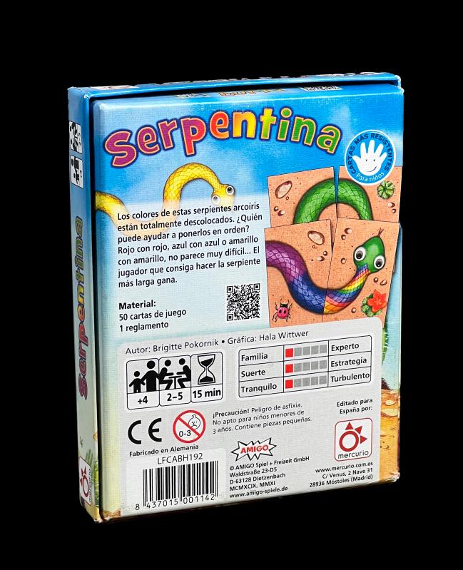 ¿Quién puede ayudar a poner los colores en orden? Rojo con rojo, azul con azul, amarillo con amarillo... ¡Es fácil! ¿verdad? Completad las serpientes con cabeza, cuerpo y cola y llevároslas a vuestro montón. ¡El que consiga más cartas al final de la partida es el ganador!
