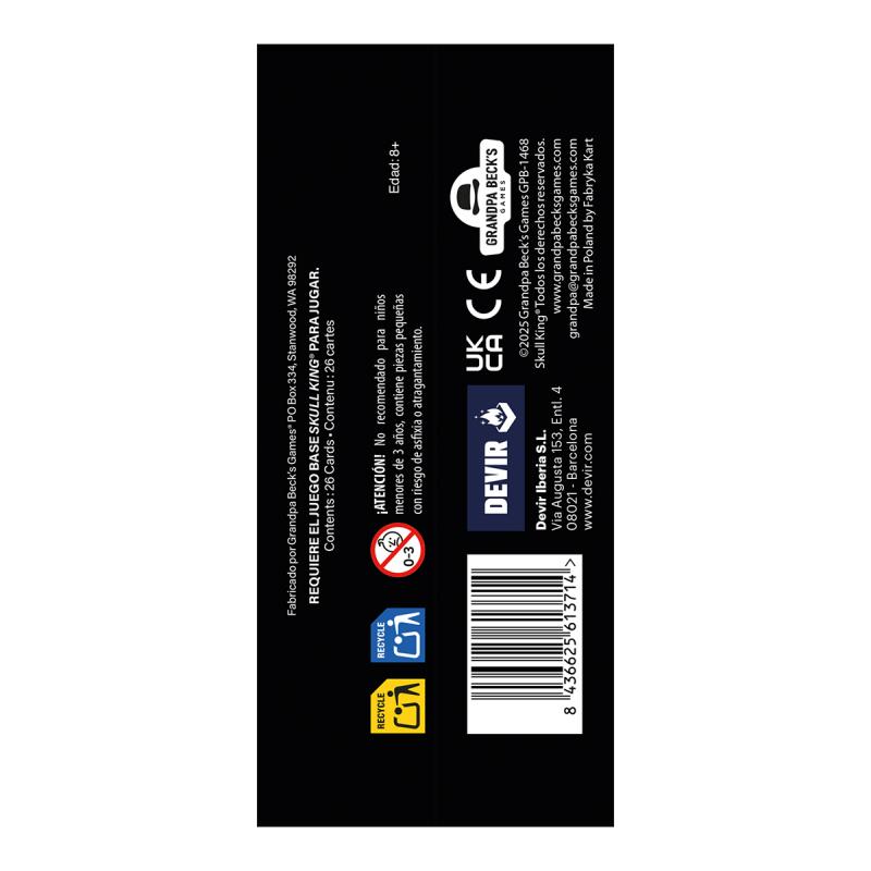 ¡Amplía tus partidas a Skull King con más cartas, más efectos y más diversión! Este sobre de expansión, que necesita el juego base para usarse, incluye 19 nuevas cartas para ampliar la partida a más jugadores y añadir poderes opcionales que darán un punto de caos a cada sesión de juego. ¿Dominaréis el arte de las bazas como verdaderos lobos de mar?
