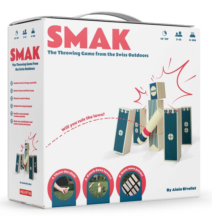 Smak es un juego de habilidad que puede jugarse en parques ...¡o en cualquier superficie en la que te atrevas a derribar torres de madera con tus lanzamientos! Formad equipos y sacad a relucir vuestra puntería, fuerza y táctica para ganar la partida. Smak ha sido diseñado por el premiado autor de juegos Alain Rivollet (co-autor de Concept).