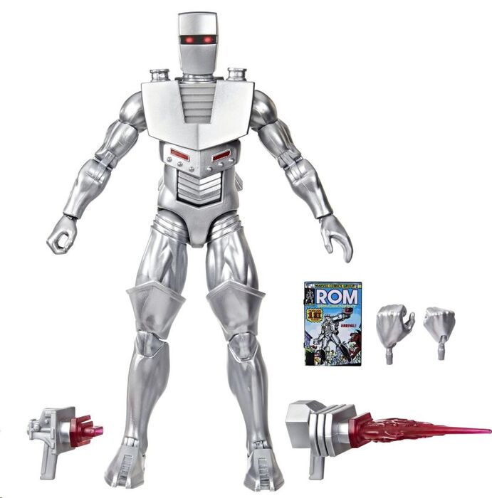 Con más de 20 puntos de articulación, esta figura permite recrear épicas escenas de combate. Incluye 6 accesorios, entre ellos 1 par de manos intercambiables, 1 efecto de combate, 1 neutralizador y 1 analizador de energía. Además, viene con una réplica en miniatura de la portada del cómic Rom: Spaceknight #1 de 1979, rindiendo homenaje a su debut en Marvel Comics.