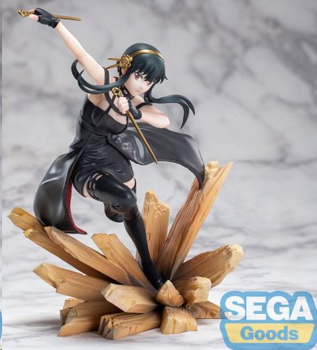 Yor Forger, también conocida como la Princesa Espinosa, luce más letal que nunca en esta espectacular figura de la línea Luminasta. La estatua captura un instante de acción pura con un dinamismo brutal: Yor se lanza con sus dagas listas para el combate, vestida con su elegante traje negro de asesina. El diseño del movimiento, desde su postura hasta el efecto en la base, transmite una energía explosiva.