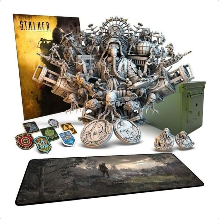 Un pack pensado exclusivamente para coleccionistas y amantes de la saga S.T.A.L.K.E.R, repleto de artículos de alta calidad. El más espectacular es una maqueta de 25 cm de alto donde se muestran lugares, personajes, enemigos y detalles del juego. También se incluyen un montón de objetos exclusivos: dos posavasos, dos imanes, 7 parches de facción, un póster metálico de 42x225 cm y un tapete de neopreno de 80x30. Y todo ello viene dentro de una gran caja metálica de 327x184x228 mm, con un acabado verde militar que evoca las clásicas cajas de munición.