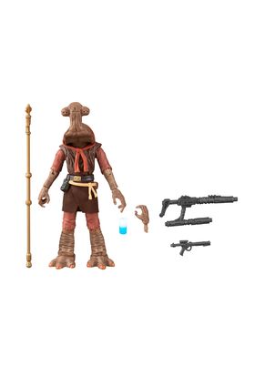 Cuenta con múltiples puntos de articulación y viene acompañada de un completo set de accesorios: 1 mano alternativa, 1 bláster, 1 cañón láser doble, 1 vaso y 1 bastón, perfectos para recrear escenas emblemáticas o imaginar nuevas aventuras galácticas.