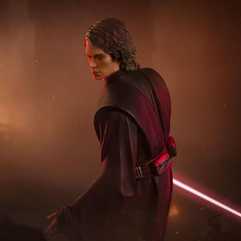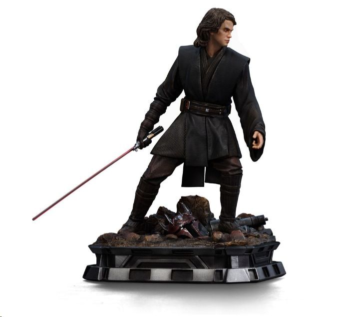 Anakin está representado con su característico atuendo oscuro y su sable láser en mano, transmitiendo toda la fuerza y conflicto que definen al personaje. La base, con detalles que evocan un campo de batalla lleno de escombros galácticos, añade profundidad y dramatismo a la figura.