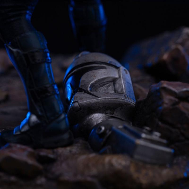 El nivel de detalle es impresionante, desde su icónico atuendo hasta las expresiones de su rostro, que reflejan la determinación y destreza que la han convertido en un personaje icónico de la saga. La base, diseñada con elementos de terreno rocoso y detalles galácticos, complementa la escena y añade profundidad a la figura.